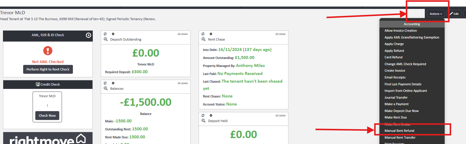 1) To make a manual rent refund, please go to the tenant profile first > click "Actions" in the top right > add how much you wish to refund