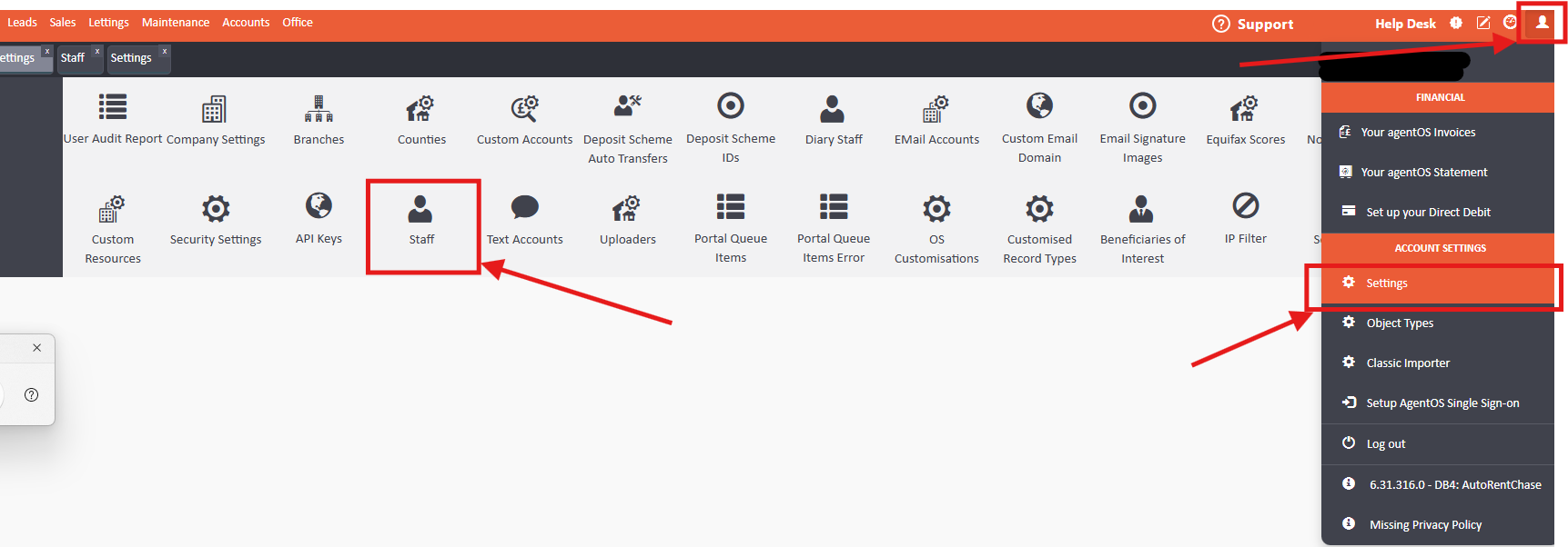 1. Search for the staff member using the search box by typing "Staff NAME." Alternatively, you can go to User Icon>Settings>Staff