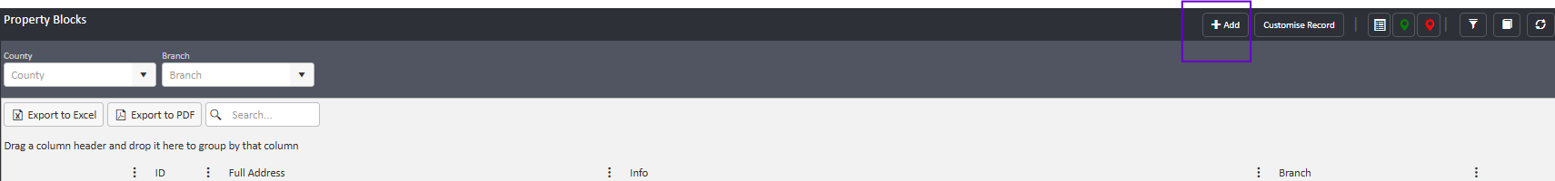 Add the details of the overall block in the same way you would add a standard property to the system. Once you've added the basic details you can go into the record to add things like certificates and maintenance jobs to the block itself, rather than an individual property.