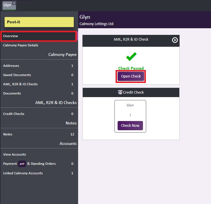 Once an AML check has been completed by your client, you'll be able to download and view a copy of the completed report for that check. You can do this by heading to the payee you've raised the check on > Overview > Open Check.