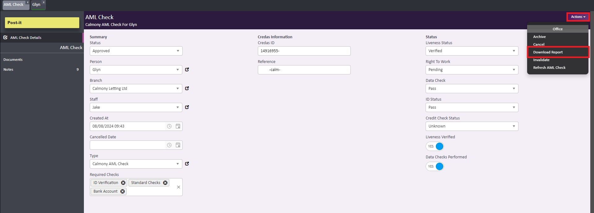 Lastly, there may be some Submitted checks that do not have a full report available to download right away. This can happen where Credas, the company who manages our AML checks need a little more time to review submitted documentation/evidence. If the check does not update within 24 hours, please contact Support for further assistance.
