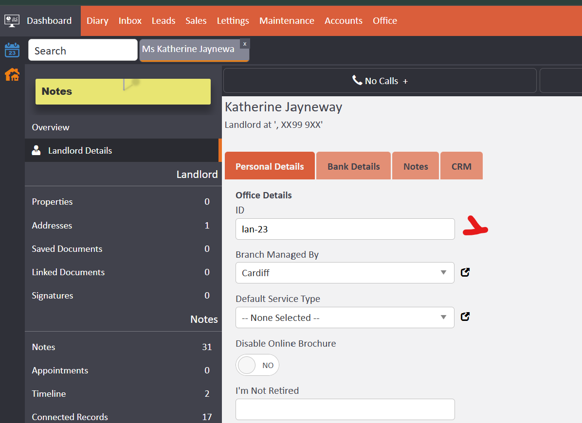 Each record in the system is identified by a unique Global Reference Number, which allows you to cross check between Fixflo and AgentOS. For example, a landlord would include LAN-12, as shown in this screenshot.