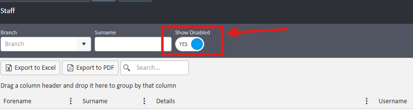 if you are unable to locate your staff member on the staff list, their account may have been disabled If you click on the toggle switch to show disabled staff, then use the search function to applicable staff member.