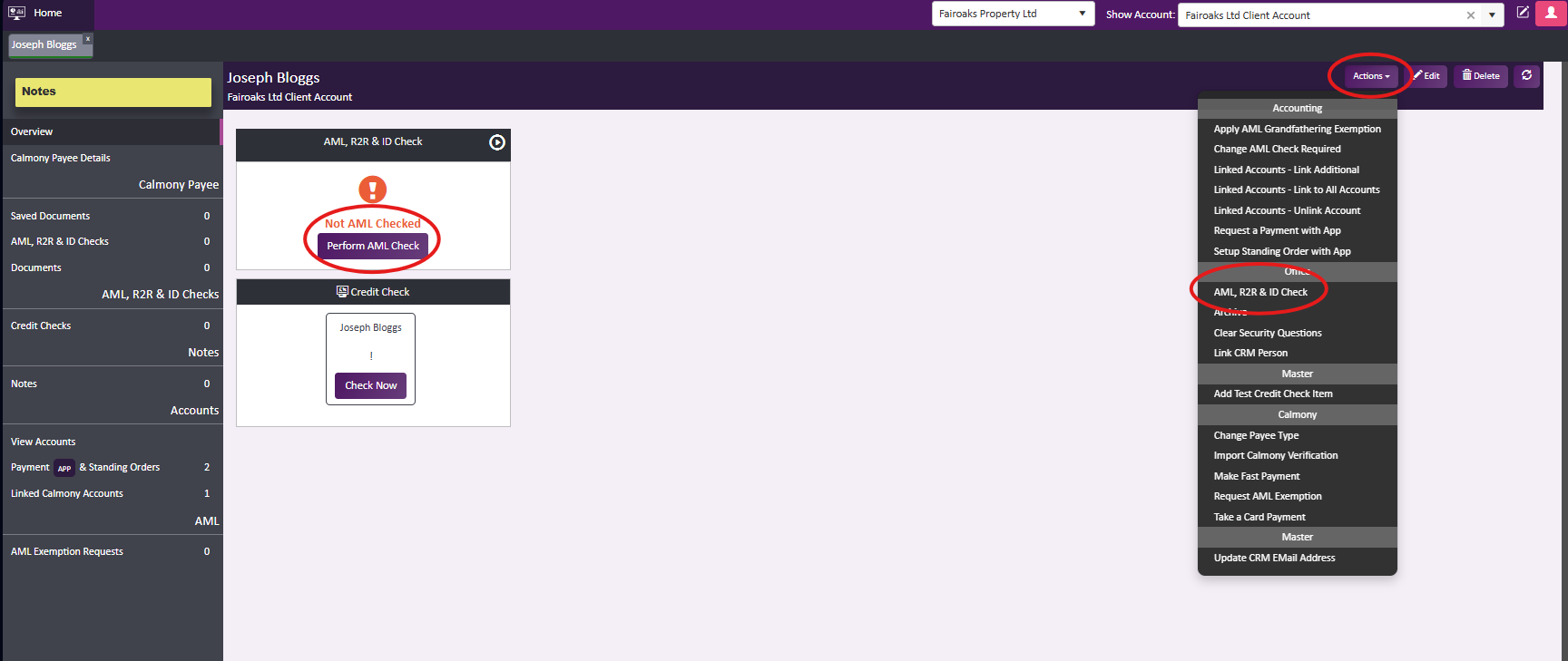 There are multiple ways to begin the check. You'll find the option under the Action in the top right of a person's profile, then 'AML, R2R & ID Check'. Alternatively, you can just click the 'Perform Check' button on the AML Widget;