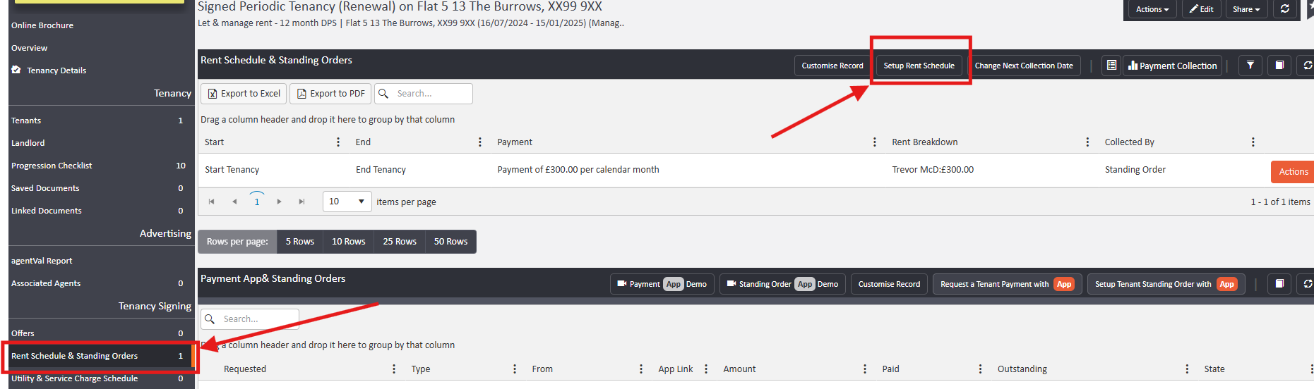 You will need to go to the "Rent Schedule and Standing Order" section in the left hand ladder on the tenancy, and select "set up Rent Schedule".