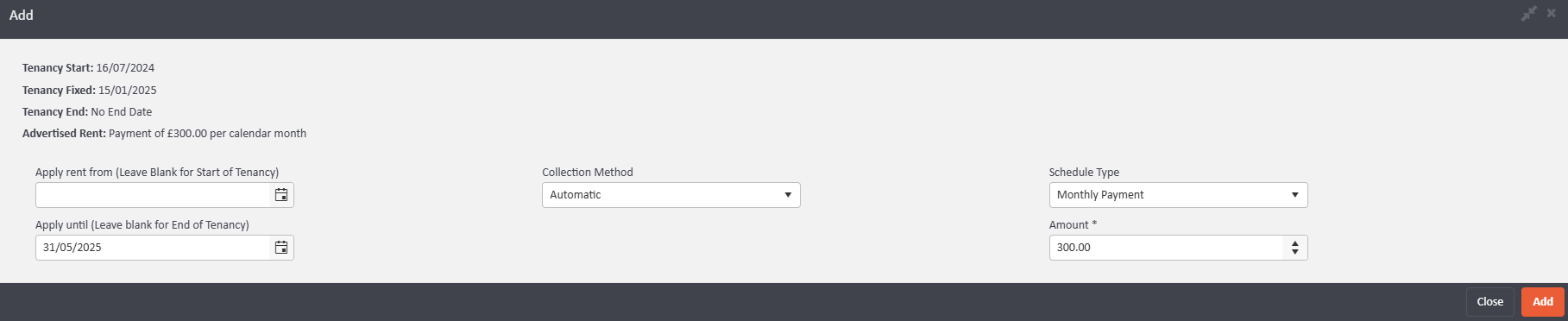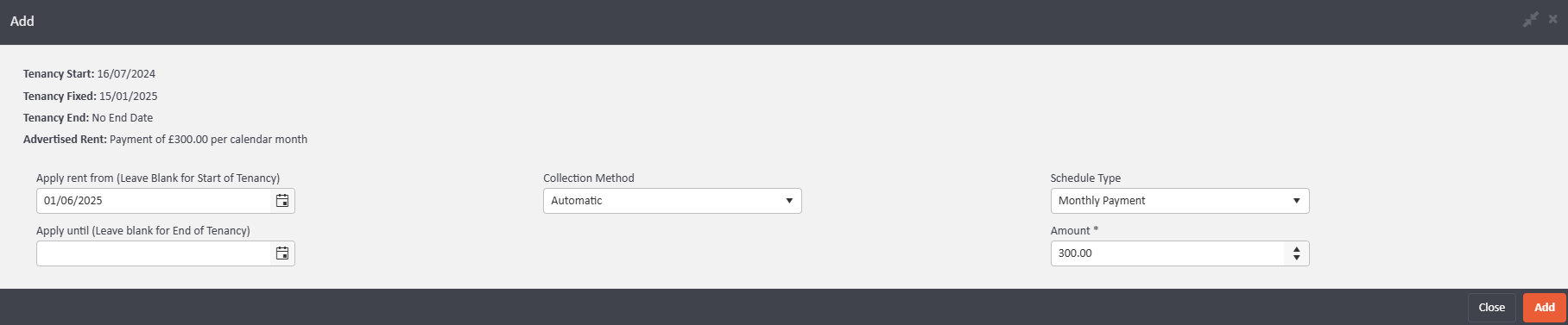 The first line will be your historic line where the start date will be the day after the last schedule line, or left blank for the start of the tenancy, and the End date will be before the day before the new payment date (in this example its 31st may). Set the payment collection method amount and frequency as per the previous schedule. and select add.