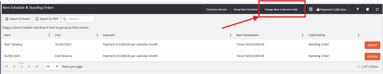 The important thing to remember when applying these changes is that any changes need to be set to take effect in the future as the dates need to be passed through to trigger correctly. in the example below, the rent date is currently the 15th of the month and Its being changed to the 1st, and it's currently 7th