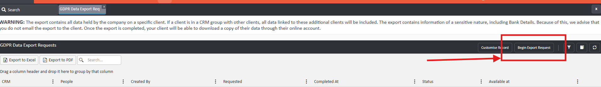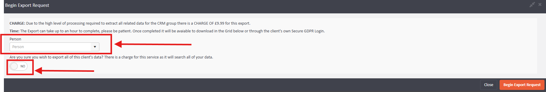 You will see a pop up with a warning that this is a chargeable service and current pricing. Enter the Person who's request you wish to carry out and toggle the switch to "yes", and begin export request.