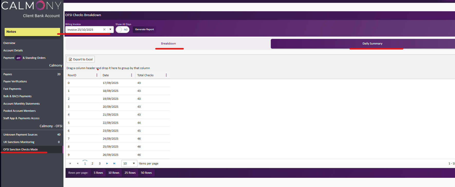To see a breakdown, of who is currently being checked, you can generate a report under the OFSI Sanctions Checks Made section of your account. At the top of this report, you can select which invoice you want to query.