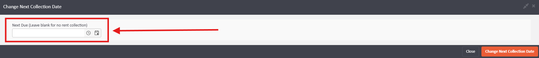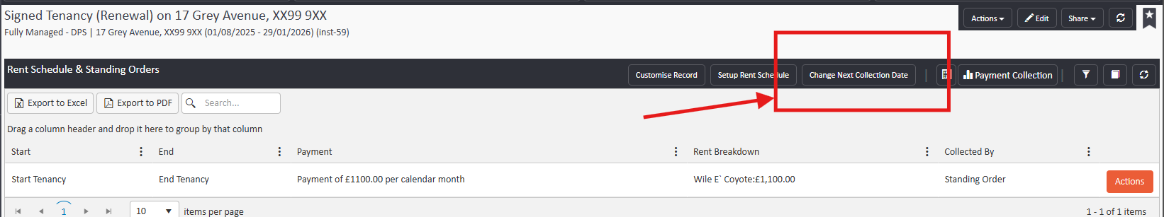 - Has the Rent Schedule been updated and/or the collection date been removed? The system will cease calling for rent if the Next Collection Date has been removed. You can check this via the Rent Schedule > Change next collection date:
